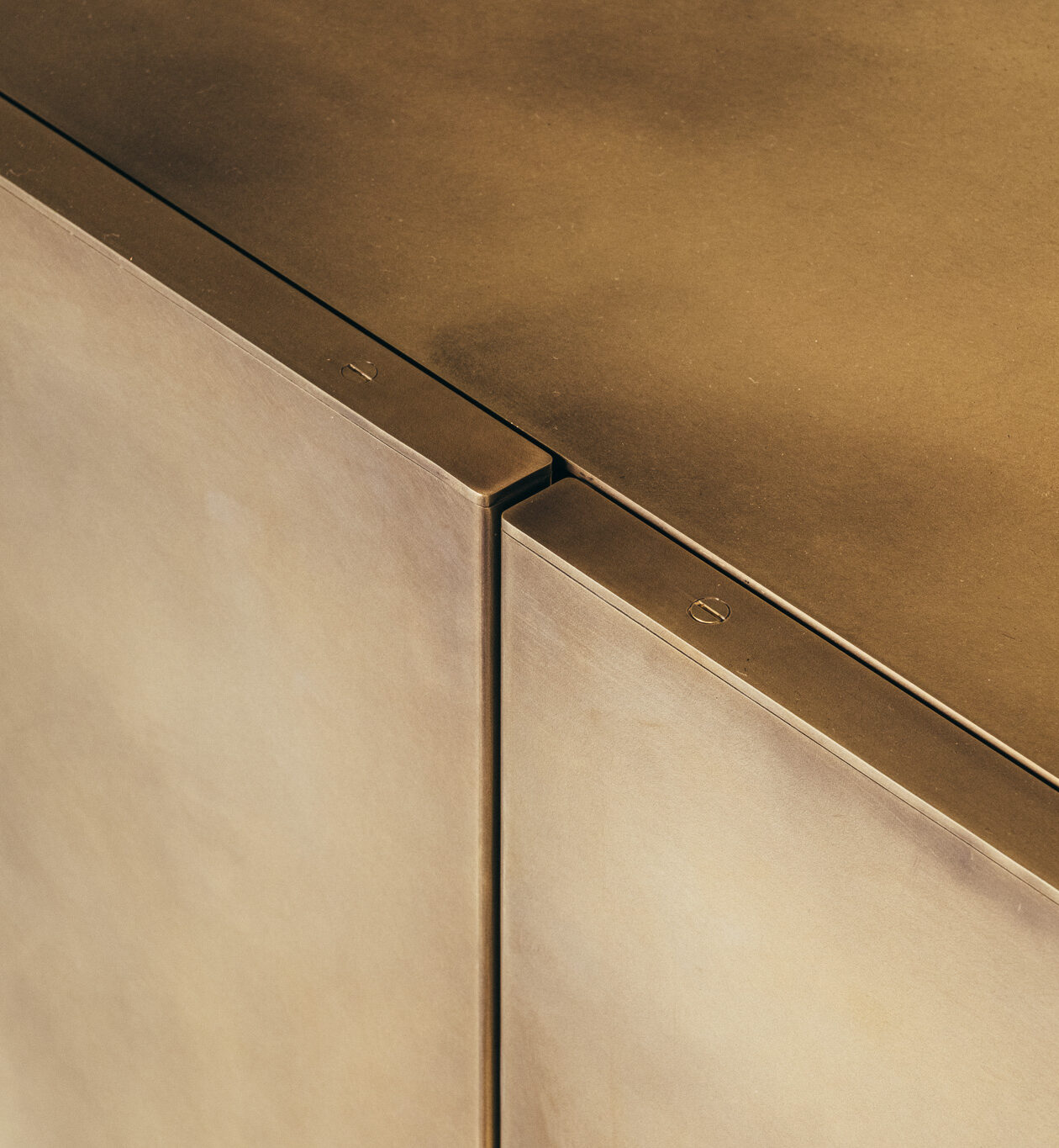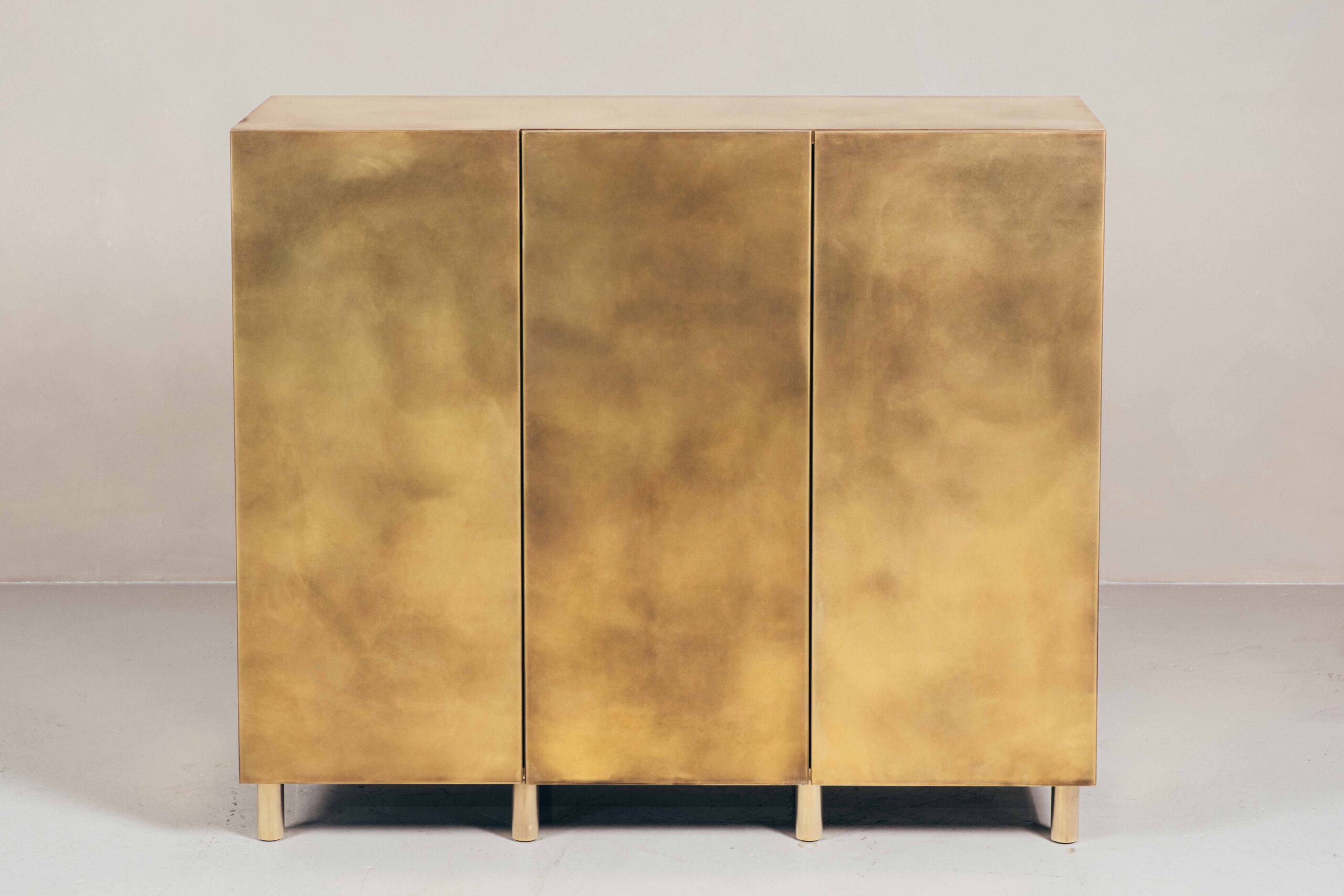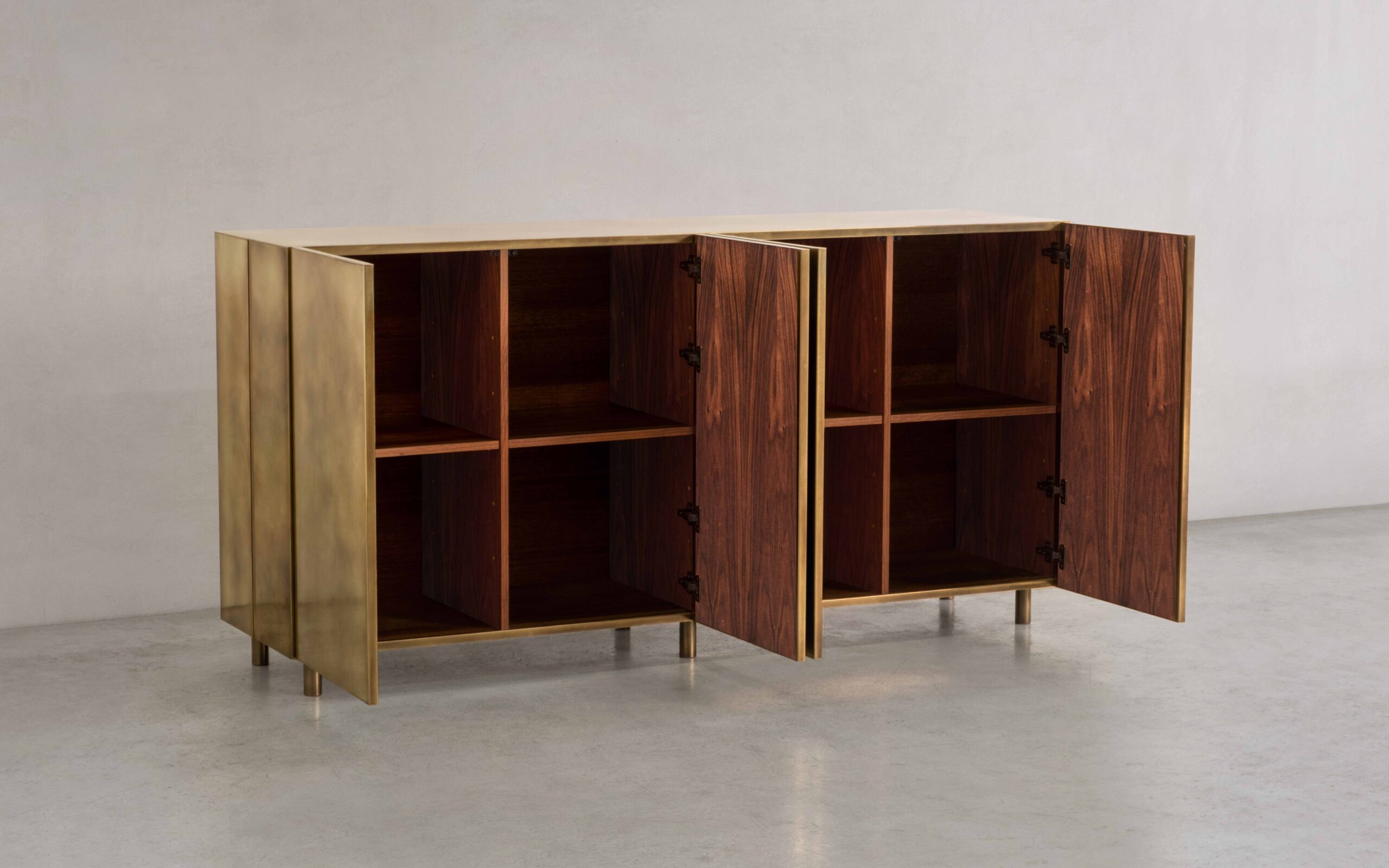 A four-doored sideboard in hand-patinated brass. Each door operates on push-to-open, soft-close hinges.