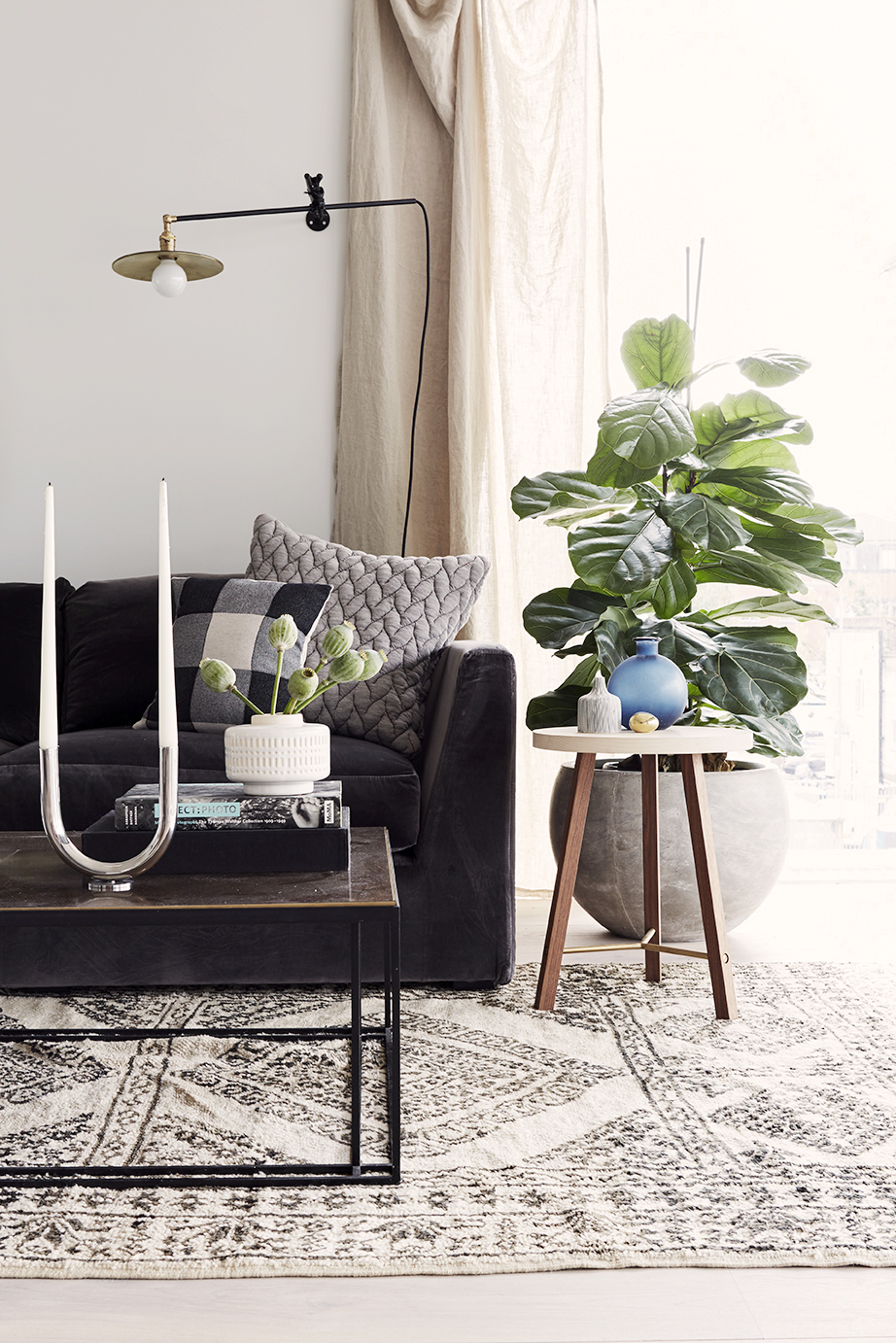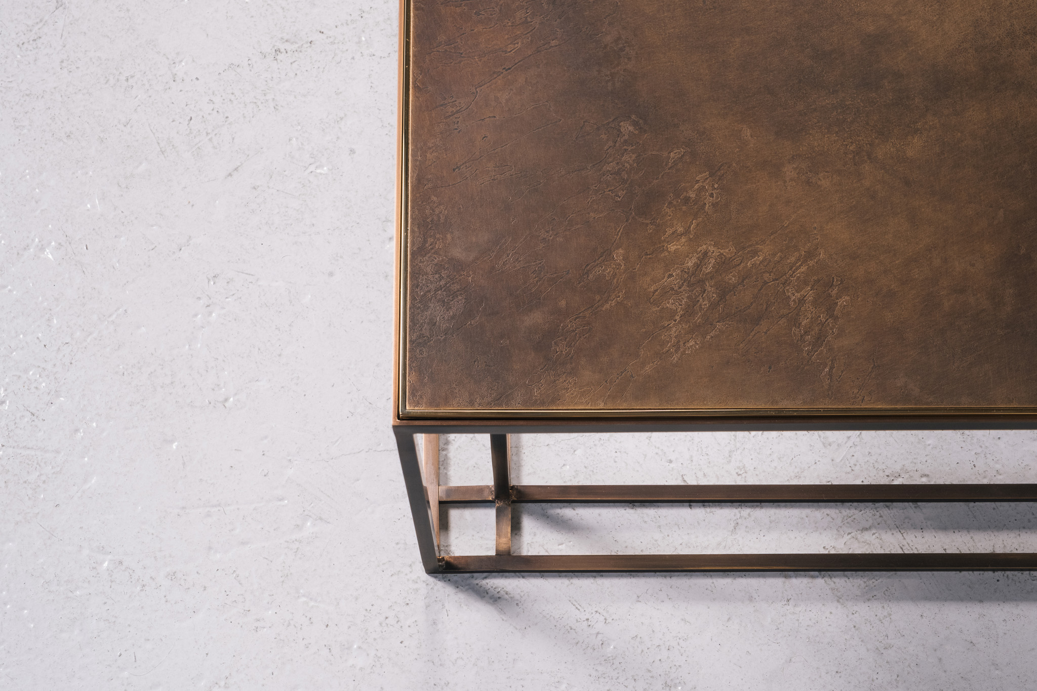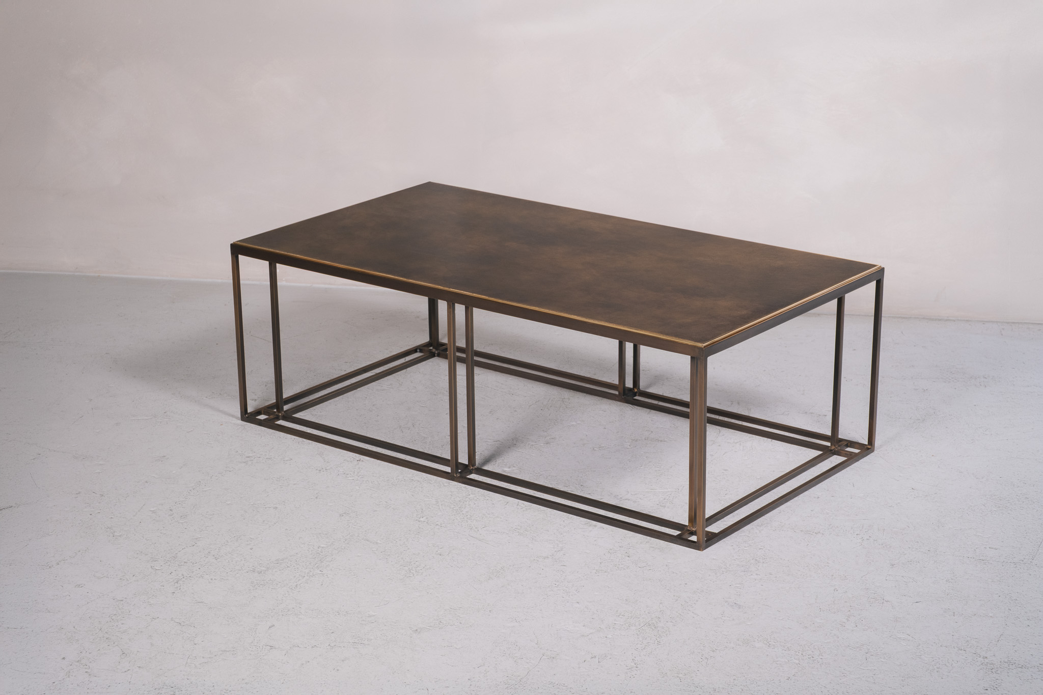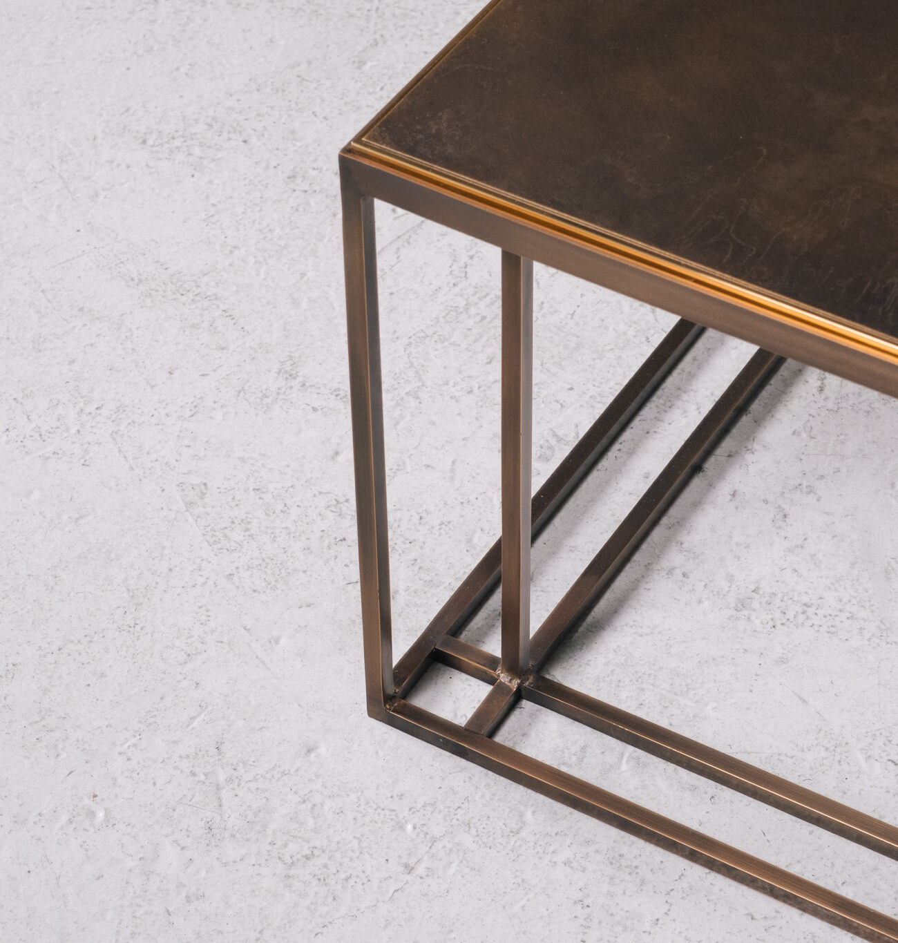 A coffee table in blackened steel and patinated brass, with a polished brass trim.