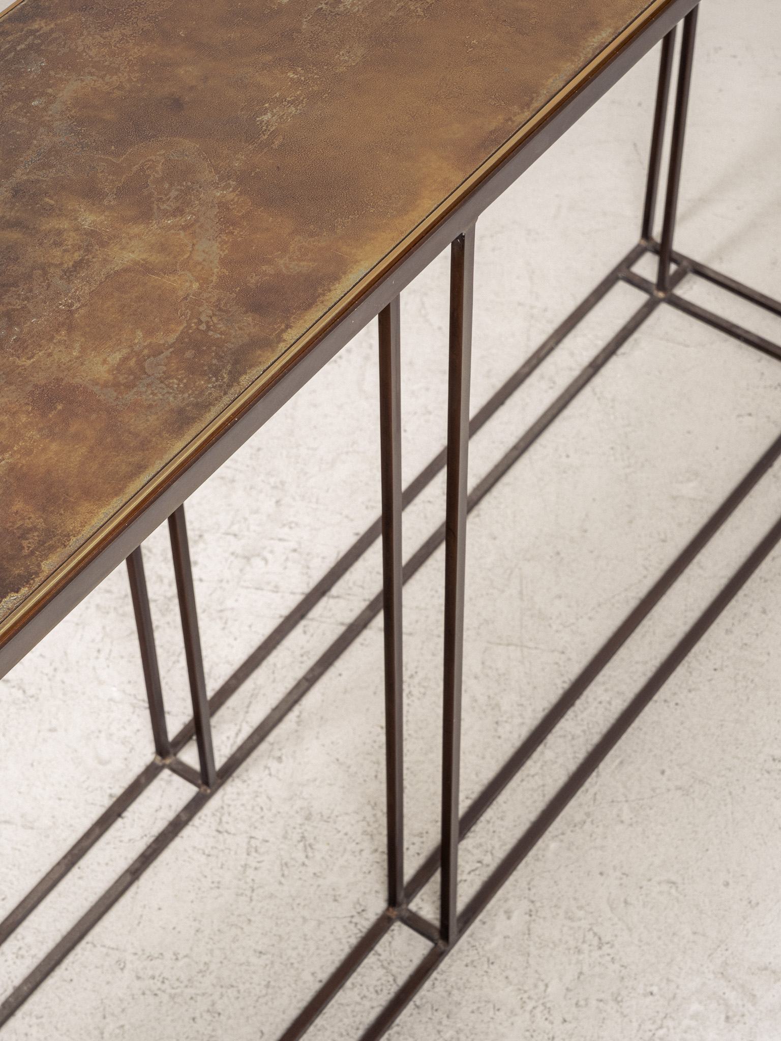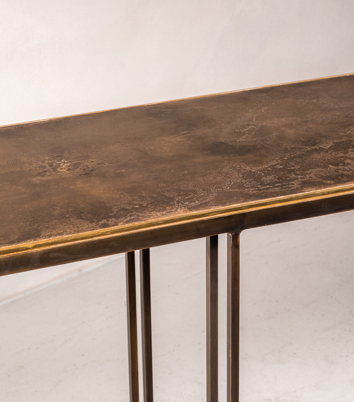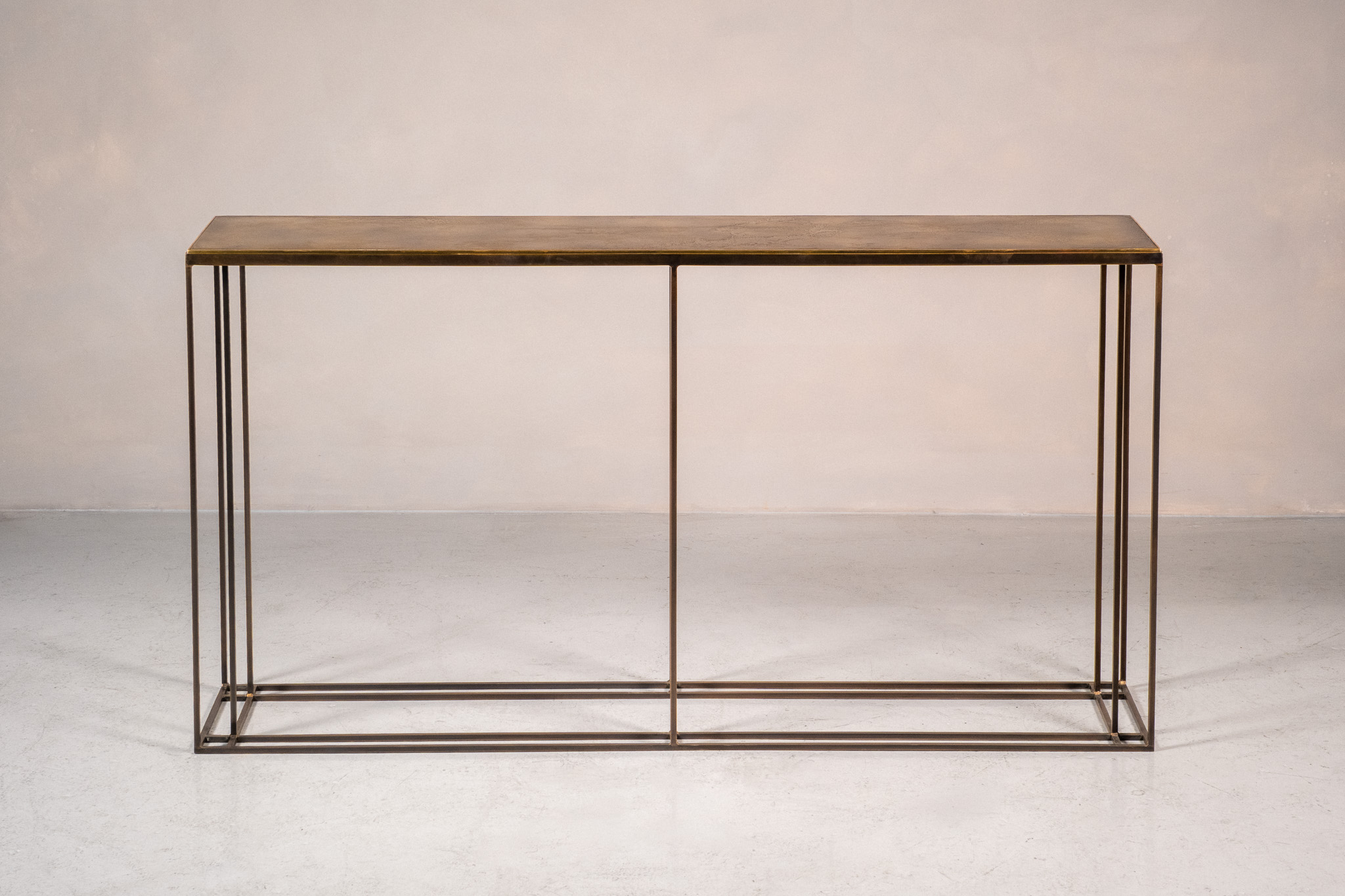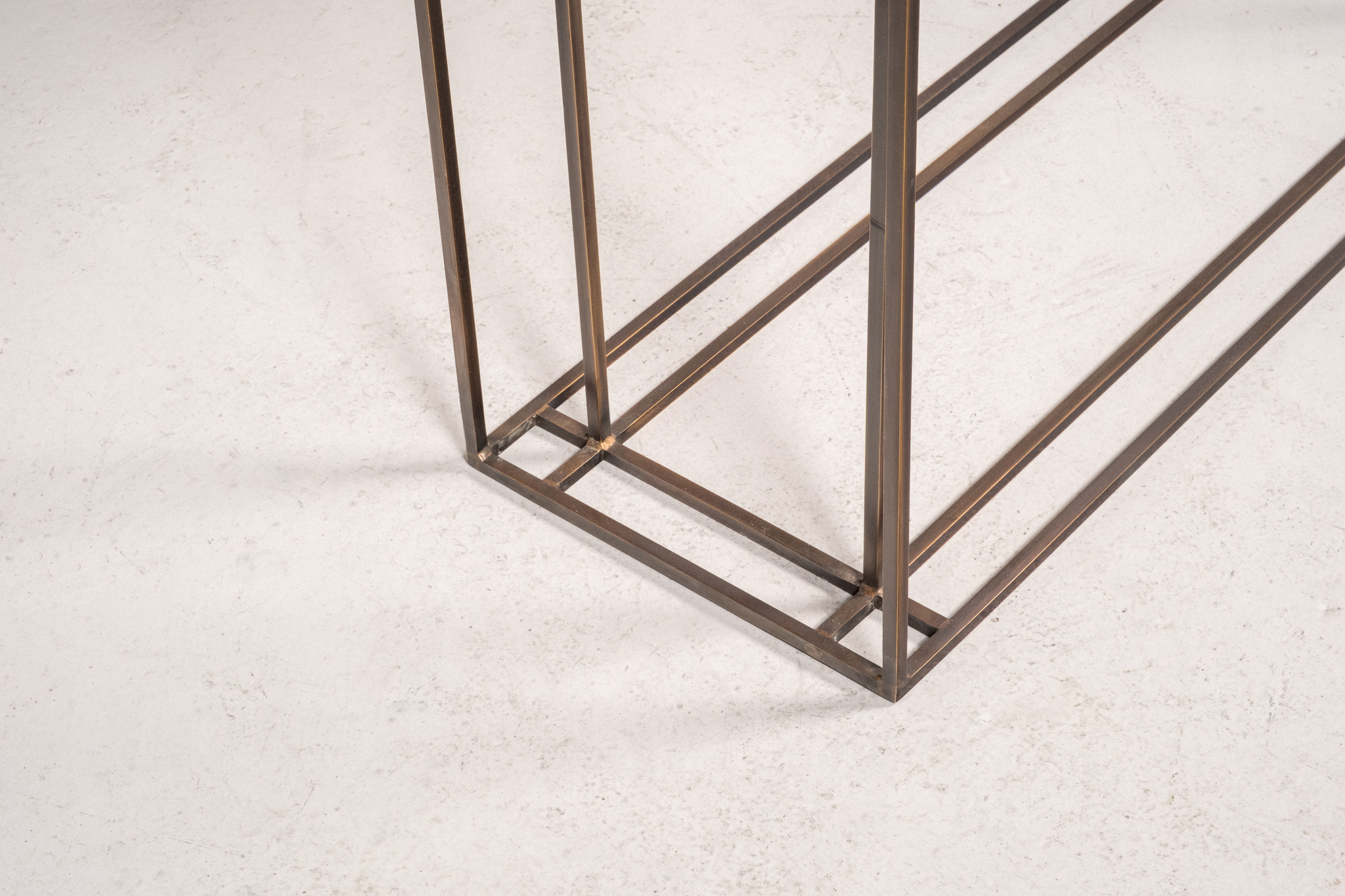 A console table crafted from brass or steel extrusions, available in a range of bespoke finishes.
